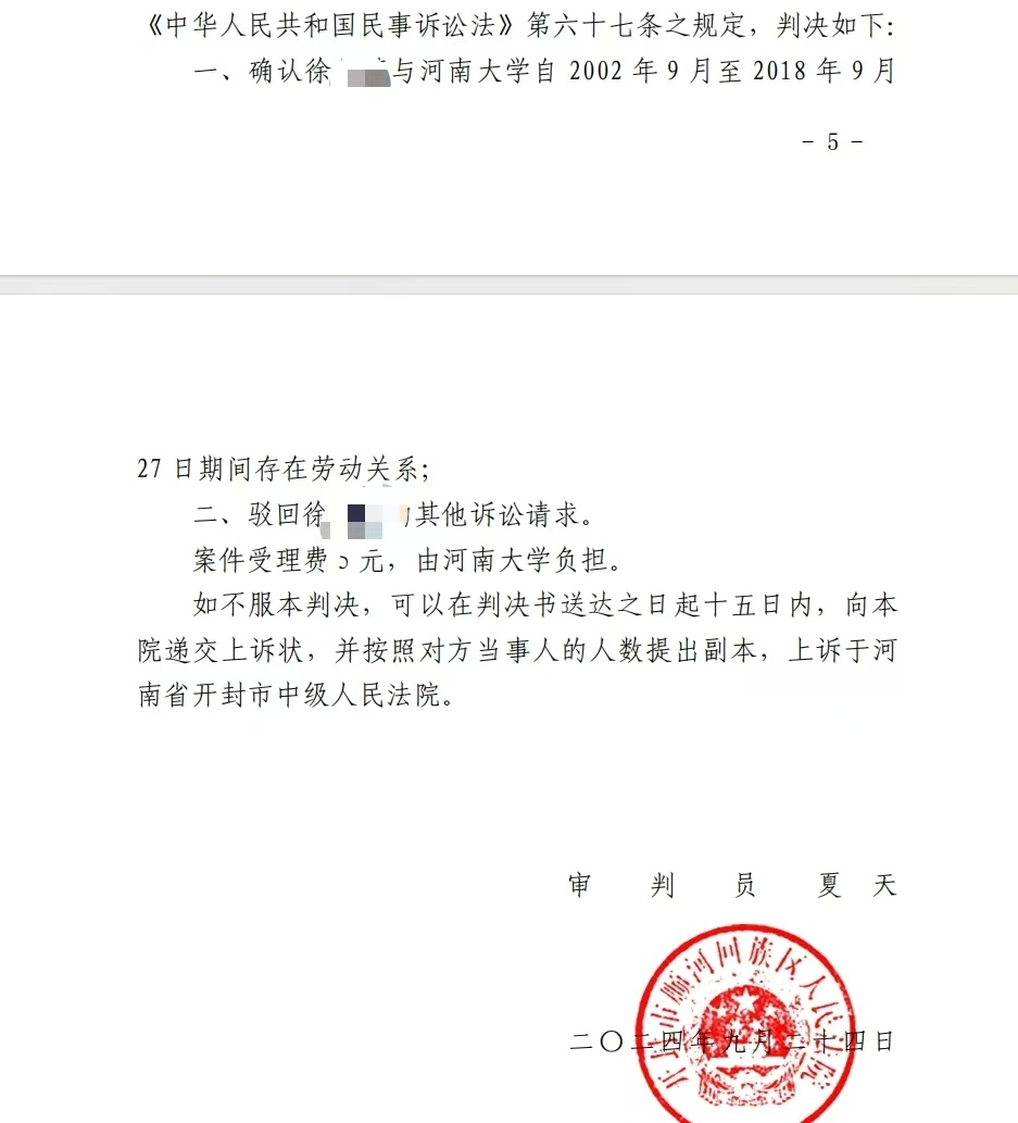 随后,她不断向学校反映此事,并在2024年6月,将河南大学起诉至法院。开封市顺河区法院出具的《民事判决书》显示,确认徐女士与河南大学自2002年9月至2018年9月期间存在劳动关系。